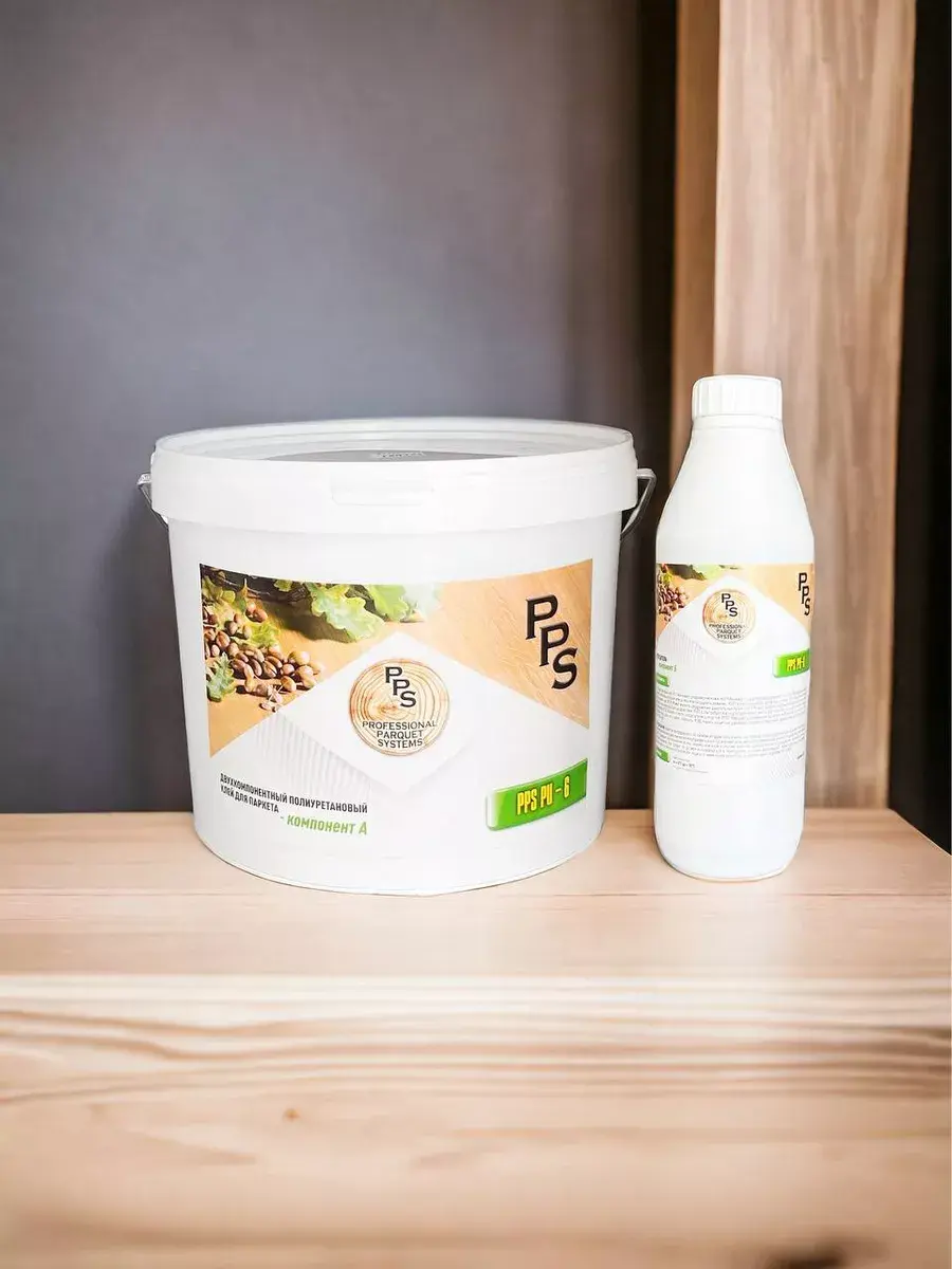 PPS-2K PU двухкомпонентный быстротвердеющий жестко-эластичный клей на основе полиуретана для деревянных покрытий. Предназначен для приклеивания деревянных напольных покрытий по всей поверхности.