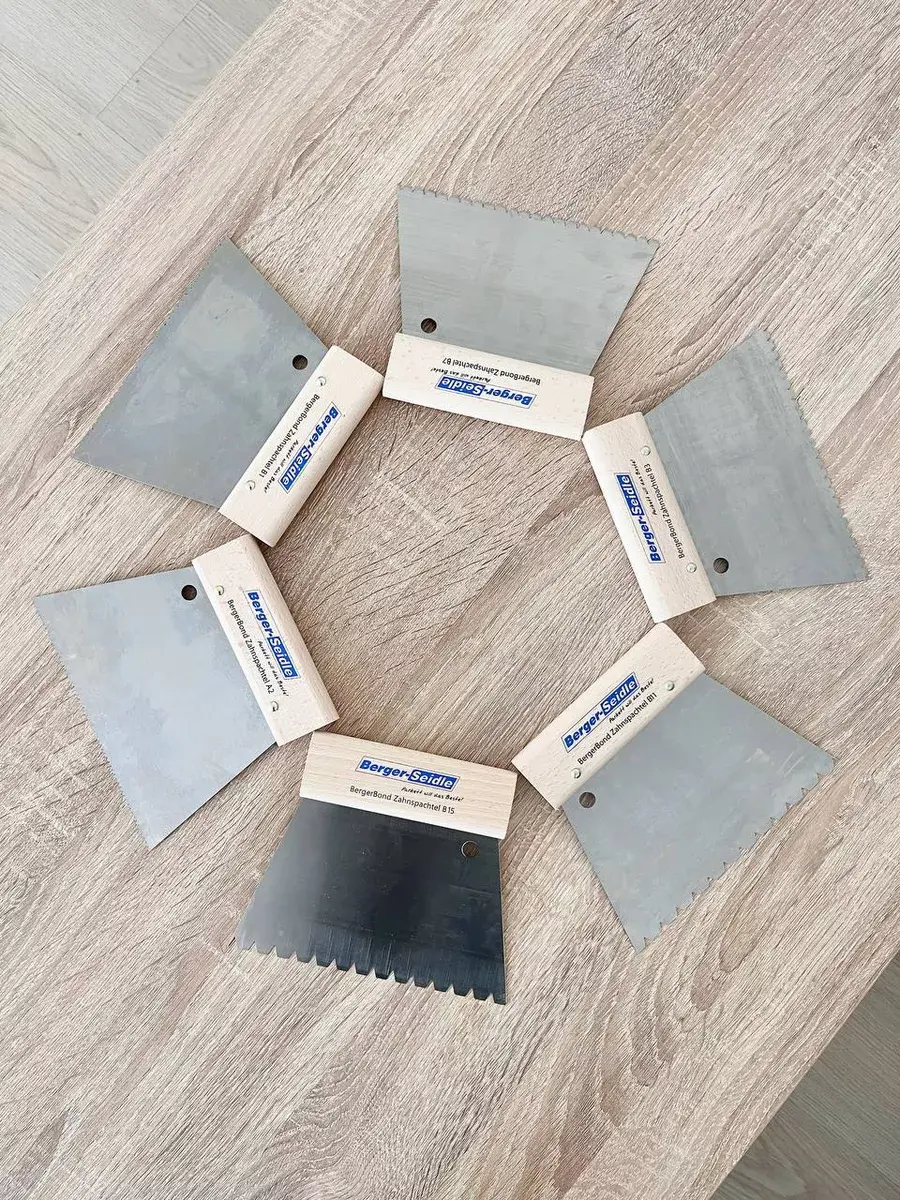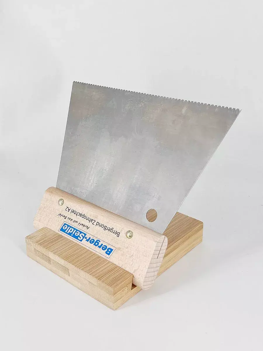 Шпатель зубчатый для клея Berger-Seidle A2 имеет прочную и удобную в использовании конструкцию. Шпатель изготовлен в виде гребенки. Полотно шпателя выполнено из нержавеющей стали, а ручка – из дерева. Ручка шпателя для клея надежно зафиксирована на полотне. Имеет частые трапециевидные зубья с оптимальным шагом. Шпатель Berger-Seidle A2 равномерно распределяет клей по рабочей поверхности, предотвращая его вылезание через стыки укладываемого напольного покрытия и уменьшая время его открытой выдержки. Способствует сокращению расхода клея. Трапециевидная форма шпателя обеспечивает быстрое нанесение и распределение клея по поверхности, что ускоряет рабочий процесс