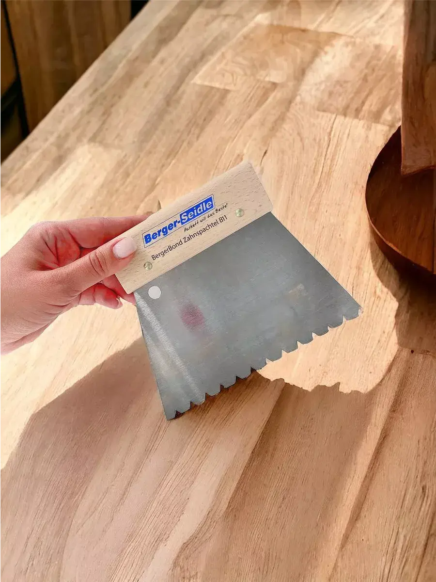 Шпатель зубчатый для клея Berger-Seidle В11 имеет прочную и удобную в использовании конструкцию. Шпатель изготовлен в виде гребенки. Полотно шпателя выполнено из нержавеющей стали, а ручка – из дерева. Ручка шпателя для клея надежно зафиксирована на полотне. Имеет частые трапециевидные зубья с оптимальным шагом. Шпатель Berger-Seidle В11 равномерно распределяет клей по рабочей поверхности, предотвращая его вылезание через стыки укладываемого напольного покрытия и уменьшая время его открытой выдержки. Способствует сокращению расхода клея. Трапециевидная форма шпателя обеспечивает быстрое нанесение и распределение клея по поверхности, что ускоряет рабочий процесс