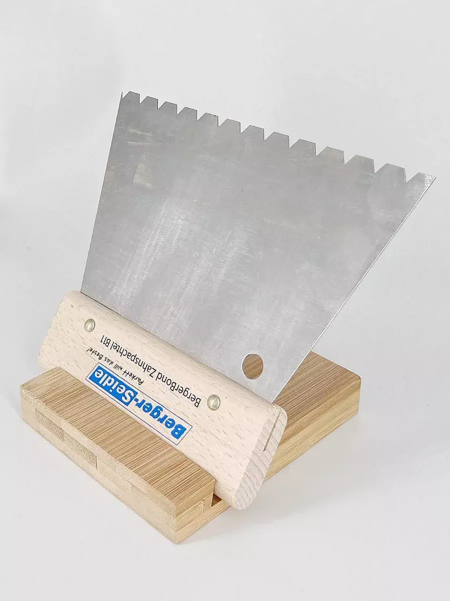 Шпатель зубчатый для клея Berger-Seidle В15 имеет прочную и удобную в использовании конструкцию. Шпатель изготовлен в виде гребенки. Полотно шпателя выполнено из нержавеющей стали, а ручка – из дерева. Ручка шпателя для клея надежно зафиксирована на полотне. Имеет частые трапециевидные зубья с оптимальным шагом. Шпатель Berger-Seidle В15 равномерно распределяет клей по рабочей поверхности, предотвращая его вылезание через стыки укладываемого напольного покрытия и уменьшая время его открытой выдержки. Способствует сокращению расхода клея. Трапециевидная форма шпателя обеспечивает быстрое нанесение и распределение клея по поверхности, что ускоряет рабочий процесс
